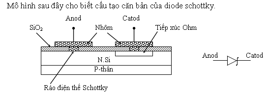 Ta thấy trong diode schottky, thường người ta dùng nhôm để thay thế chất bán dẫn loại P và chất bán dẫn loại N là Si. Do nhôm là một kim loại nên rào điện thế trong diode schottky giảm nhỏ nên điện thế ngưỡng của diode schottky khoảng 0,2V đến 0,3V. Để ý là diode schottky có điện thế bảo hoà ngược lớn hơn diode Si và điện thế sụp đổ cũng nhỏ hơn diode Si.