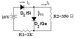 - Dùng kiểu mẫu lý tưởng và điện thế ngưỡng của diode để tính dòng điện I1, I2, ID2 trong mạch điện sau: