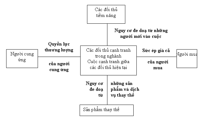 Trong nền cạnh tranh kinh tế thị trường, bất kỳ một doanh nghiệp nào hoạt động trên thị trường cũng đều phải chịu một áp lực cạnh tranh nhất định, mà hiện trạng cuộc cạnh tranh phụ thuộc vào 5 lực lượng cạnh tranh cơ bản, được biểu diễn bởi mô hình sau: