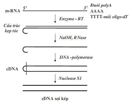 Tổng hợp cDNA từ mRNA nhờ kỹ thuật của Gubler và Hoffman với sự có mặt của enzyme phiên mã ngược (Rever transcriptase - Hình dưới). Sau đó, cDNA (complementary) gắn vào plasmid và biến nạp vào vi khuẩn để tạo dòng cDNA. Phương pháp này được trình bày ở Chương 6 (thiết lập thư viện cDNA).