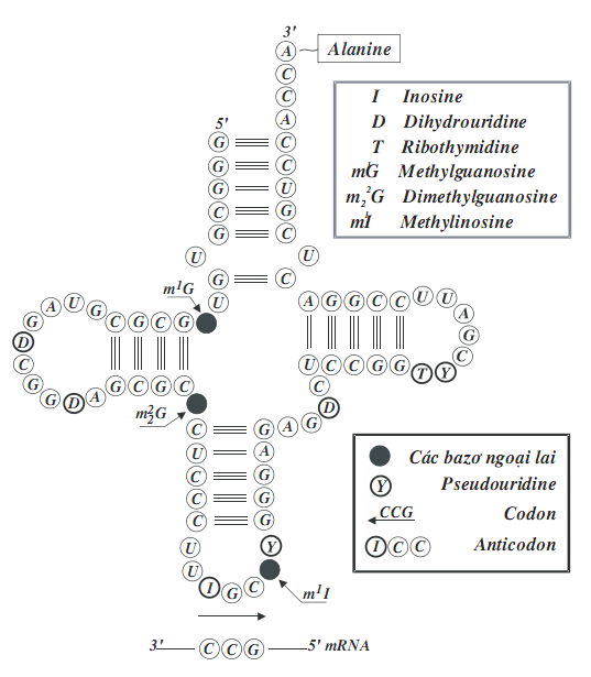 - Đầu 3’ kết thúc bằng 3 nucleotide CCA−OH. Phân tử aminoaxit luôn luôn gắn ở đầu 3’ ở bazơ A cuối.