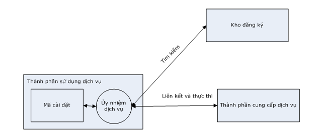 Thành phần cung cấp dịch vụ cung cấp một uỷ nhiệm dịch vụ cho thành phần sử dụng dịch vụ. Thành phần sử dụng dịch vụ thực thi các yêu cầu bằng cách gọi một hàm API trên nó. Uỷ nhiệm dịch vụ (hình 1.9) sẽ tìm một giao ước và một tham chiếu tới thành phần cung cấp dịch vụ trong nơi đăng ký. Sau đó, nó định dạng thông điệp yêu cầu và thực thi yêu cầu trên danh nghĩa của thành phần sử dụng dịch vụ. Uỷ nhiệm dịch vụ là một thực thể không bắt buộc, nó chỉ đơn giản hoá cho thành phần sử dụng dịch vụ và thành phần sử dụng dịch vụ hoàn toàn có thể viết phần mềm để truy cập tới dịch vụ.