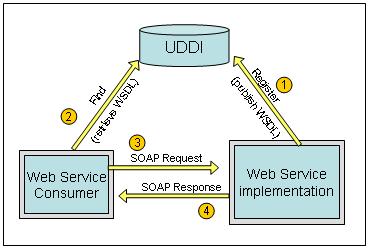 Giữa ba thành phần: cung cấp dịch vụ, sử dụng dịch vụ, đăng ký dịch vụ, việc trao đổi dữ liệu hoàn toàn dùng giao thức SOAP và nội dung bên trong được định dạng bằng XML.