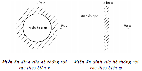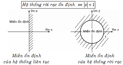 Ta đã biết hệ thống điều khiển liên tục ổn định nếu tất cả các nghiệm của phương trình đặc tính đều nằm bên trái mặt phẳng phức. Do quan hệ giữa biến z và biến s là