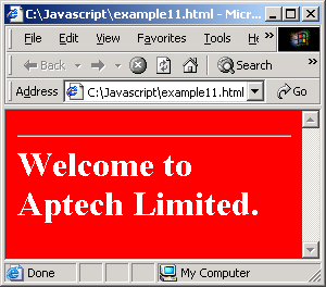<html> <head> <script language="JavaScript"> <!-- var todays_date = new Date(); var seconds = todays_date.getSeconds(); var b_color = (seconds >=3 && seconds <=50) ? "Red" : "Green"; document.write("<body text=White bgcolor=" + b_color + ">"); //--> </script> </head> <h1> <hr> Welcome to Aptech Limited. </hr> </h1> </body> </html>