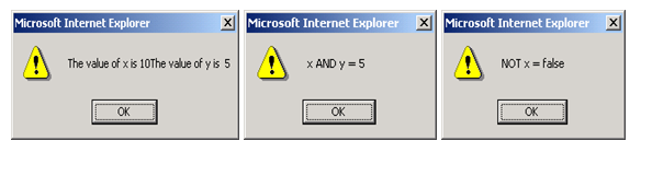 Toán tử Giá trị Mô tả And ( &&) expr1 && expr2 Trả về giá trị của expr1 nếu nó là false. Nếu không thì nó trả về giá trị của expr2. Or ( ||) expr1 || expr2 Trả về giá trị của expr1 nếu nó là true. Nếu không thì nó sẽ trả về giá trị của expr2. Not (!) !expr Trả về giá trị false nếu biểu thức đúng và trả về giá trị true nếu biểu thức sai. <HTML> <HEAD> <SCRIPT LANGUAGE="JavaScript"> var x = 10; var y = 5; alert ("The value of x is " + x + "The value of y is " + y); alert("x AND y = " + (x && y)); alert("x OR y = " + (x || y)); alert("NOT x = " + (!x)); </SCRIPT> </HEAD> </HTML>Kết quả: