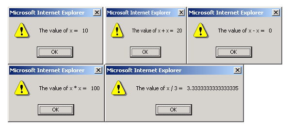 Toán tử Mô tả Ví dụ + Phép cộng A = 5 + 8 - Phép trừ A = 8 - 5 / Phép chia A = 20 / 5 % Phép chia lấy số dư 10 % 3 = 1 ++ Tăng lên một đơn vị. Toán tử này nhận một toán hạng. Giá trị của toán hạng sẽ tăng lên 1 đơn vị. Giá trị được trả về sẽ tuỳ thuộc vào toán tử ++ nằm sau hay nằm trước toán hạng. ++x sẽ trả về giá trị của x sau khi tăng.x++ sẽ trả về giá trị của x trước khi tăng. - - Giảm một đơn vị. Toán tử này nhận một toán hạng. Giá trị được trả về tuỳ thuộc vào toán tử -- nằm trước hay nằm toán hạng. --x sẽ trả về giá trị của x sau khi giảm. x-- sẽ trả về giá trị của x trước khi giảm. . - Lấy số đối. Nó sẽ trả về số đối của toán hạng Nếu a là 5, thì –a = -5. <HTML> <HEAD> <SCRIPT LANGUAGE="JavaScript"> var x = 10; alert ("The value of x = " + x); alert ("The value of x + x = " + (x + x)); alert ("The value of x - x = " + (x - x)); alert ("The value of x * x = " + (x * x)); alert ("The value of x / 3 = " + (x / 3)); alert ("The value of x % 3 = " + (x % 3)); alert ("The value of --x = " + (--x)); alert ("The value of ++x = " + (++x)); alert ("The value of -x = " + (-x)); </SCRIPT> </HEAD> </HTML>Dưới đây là một số hộp thông báo: