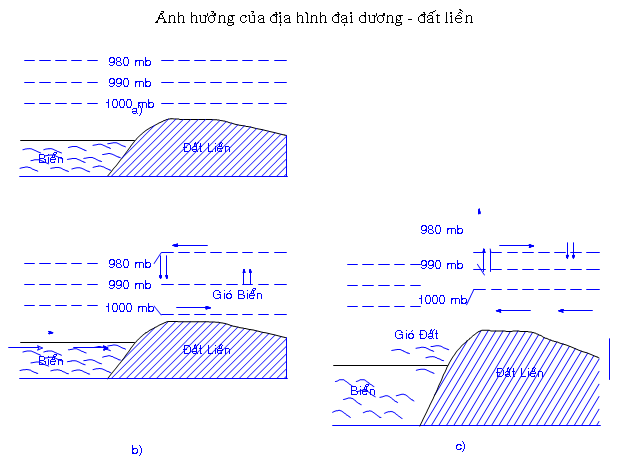 - Bề mặt của địa hình ảnh hưởng đến tốc độ gió và hướng gió (gió đất và gió biển).