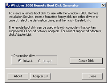 - Máy đích đó có được sự chú ý của RIS Server này thông qua giao thức Preboot Execution , viết tắt là PXE . Một số nhà sản xuất bán các PC có sẵn các PXE trong Bios . Để nối liên lạc của một PC có trong trang bị PXE với một RIS Server . Bạn thậm chí không cần một đĩa mềm nữa , bạn chỉ việc nối nó vào mạng khởi động nó sau đó bạn sẽ gặp một câu hỏi “Boot Form The Network Y/N ? ” . Nếu bạn để cho nó boot từ mạng trước hết nó sẽ tìm một DHCP Server , sau đó tìm một AD Server có DNS , rồi kết hợp tiếp tất cả các chương trình Boot mạng nằm trong Rom Bios cảu PC Tuy nhiên những người không may mắn được những máy PC không có PXE trong Bios không thể Boot từ mạng được . Microsoft đã đính kèm một trình tiện ích theo với RIS có chức năng tạo đĩa mềm Boot mạng để thay thế cho PXE Bios . Tiện ích ;à RBFG.EXE và bạn sẽ tìm thấy nó trên bất kỳ Server nào .