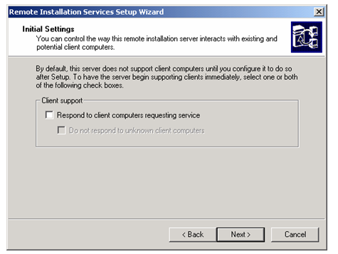 - Sau khi bạn nhấp Next , RISETUP hỏi chúng ta rằng chúng ta có muốn hồi đáp lại các yêu cầu cung cấp hệ điều hành từ các máy khách hay không , như chúng ta thấy trong hình . Bởi vì lúc này chúng ta chưa có hình ảnh nào để dùng RIS Server cả . Nên chúng bảo nó là đừng hồi đáp các yêu cầu đó (bằng cách duyệt vào ô Respond To Client Computers Requesting Service).