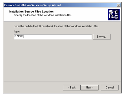 - Đây là lúc chúng ta đưa đĩa Cd-rom Win2k Pro vào ổ Cd-rom của Server này . RISETUP thường không đủ sáng dạ để biết rằng các tập tin đó nằm trong thư mục I386 , do đó thường thì nó đề nghị mẫu tự ổ đĩa của Cd-rom trên Server này . Vidụ : ổ đĩa Cd-rom trên có thể bạn phải giúp nó , chỉ cho nó biết nơi cần tìm các tập tin đó . Thay vì vậy nếu thư mục I386 của Win2k Pro trên một đĩa cứng nào đó trên Server , bạn cũng có thể chỉ cho RISETUP đến đó .
