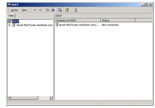 Để làm đó , chúng ta tìm mộ DHCP Server rồi đăng nhập vào nó với tư cách là một Enterprise Admin . Nhắp Start / Programs / Adminstrative Tool / DHCP . Sau đó mở menu Action ra , như trong hình