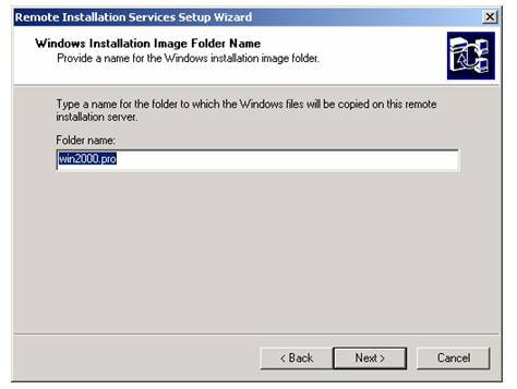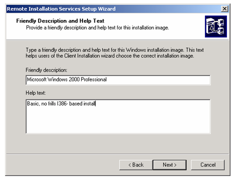 - Xin nhớ rằng một RIS Server có thể chứa nhiều hình ảnh hệ thống trên ổ đĩa RIS của nó . Mỗi hình ảnh dó chiếm một Folder bên trong Folder \ Remote Install . Hình ảnh I386 đơn thuần đầu tiên này cũng cần có một Folder và RISETUP đề nghị đơn giản là Win2k Pro . Chúng ta cũng đâu cần tên nó rườm rà gì hơn , cho nên bạn nhấp Next và bạn sẽ thấy một màn hình có thể mô tả ý nghĩa của hình ảnh đó như trong minh hoạ trong hình .