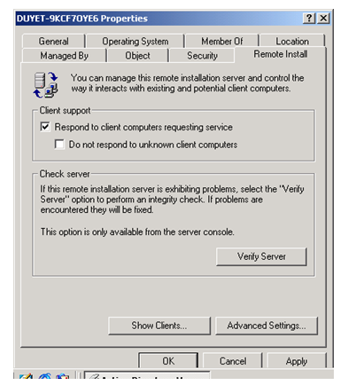 - RIS Server của chúng tôi được đặt tên là duyet-9kcf7oye6 và có vài thẻ đặc tính (Property Tab) , một cái nhãn có tên là Remote Install . Nhấp lên đó rồi bạn sẽ thấy .