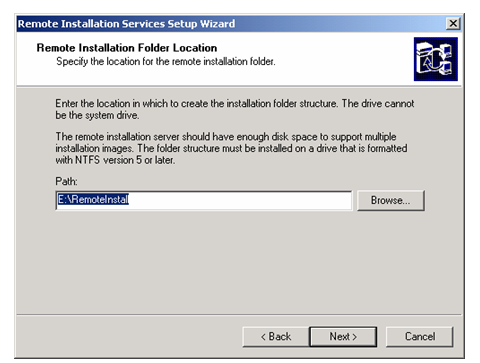 Bạn nhấp Next thế là Wizard đó nhanh chóng rà soát các ổ đĩa cứng của chúng ta để tìm ra một nơi chắc chắn để chứa các tập tin của RIS . Trong trường hợp ở đây , nó sẽ tìm thấy ổ đĩa F: . Sau đó nó cần tạo ra một thư mục tên là Remote Install , như chúng ta thấy trong hình .