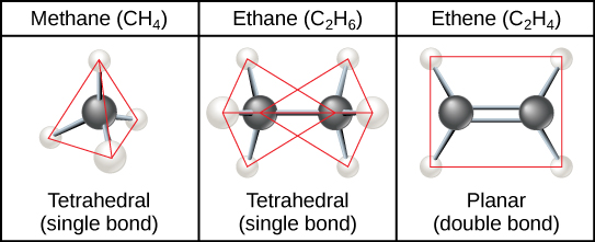 Hydrocarbon chains are formed by successive bonds between carbon atoms and may be branched or unbranched. Furthermore, the overall geometry of the molecule is altered by the different geometries of single, double, and triple covalent bonds, illustrated in [link]. The hydrocarbons ethane, ethene, and ethyne serve as examples of how different carbon-to-carbon bonds affect the geometry of the molecule. The names of all three molecules start with the prefix “eth-,” which is the prefix for two carbon hydrocarbons. The suffixes “-ane,” “-ene,” and “-yne” refer to the presence of single, double, or triple carbon-carbon bonds, respectively. Thus, propane, propene, and propyne follow the same pattern with three carbon molecules, butane, butane, and butyne for four carbon molecules, and so on. Double and triple bonds change the geometry of the molecule: single bonds allow rotation along the axis of the bond, whereas double bonds lead to a planar configuration and triple bonds to a linear one. These geometries have a significant impact on the shape a particular molecule can assume.