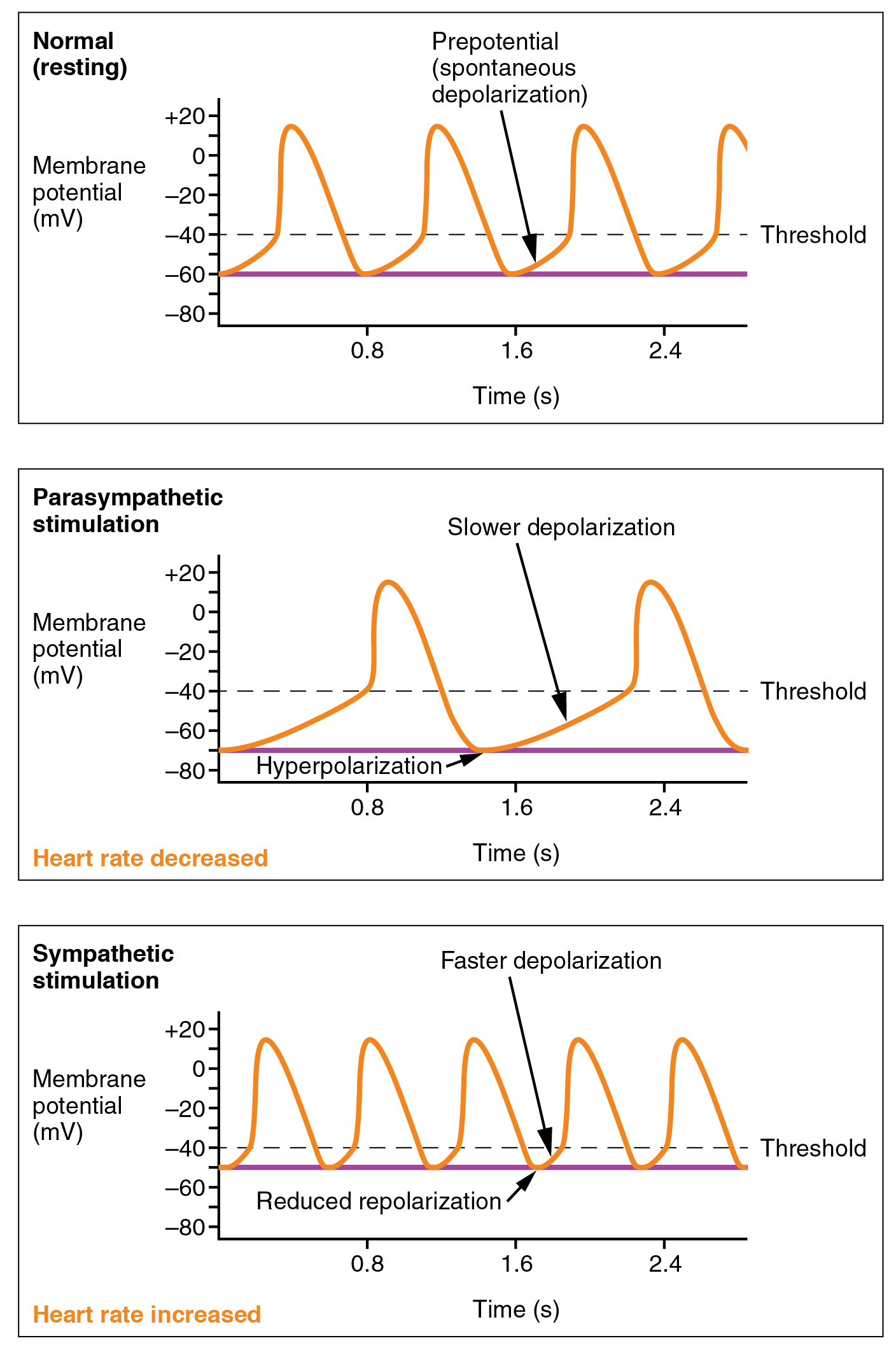 Parasympathetic stimulation originates from the cardioinhibitory region with impulses traveling via the vagus nerve (cranial nerve X). The vagus nerve sends branches to both the SA and AV nodes, and to portions of both the atria and ventricles. Parasympathetic stimulation releases the neurotransmitter acetylcholine (ACh) at the neuromuscular junction. ACh slows HR by opening chemical- or ligand-gated potassium ion channels to slow the rate of spontaneous depolarization, which extends repolarization and increases the time before the next spontaneous depolarization occurs. Without any nervous stimulation, the SA node would establish a sinus rhythm of approximately 100 bpm. Since resting rates are considerably less than this, it becomes evident that parasympathetic stimulation normally slows HR. This is similar to an individual driving a car with one foot on the brake pedal. To speed up, one need merely remove one’s foot from the break and let the engine increase speed. In the case of the heart, decreasing parasympathetic stimulation decreases the release of ACh, which allows HR to increase up to approximately 100 bpm. Any increases beyond this rate would require sympathetic stimulation. [link] illustrates the effects of parasympathetic and sympathetic stimulation on the normal sinus rhythm.