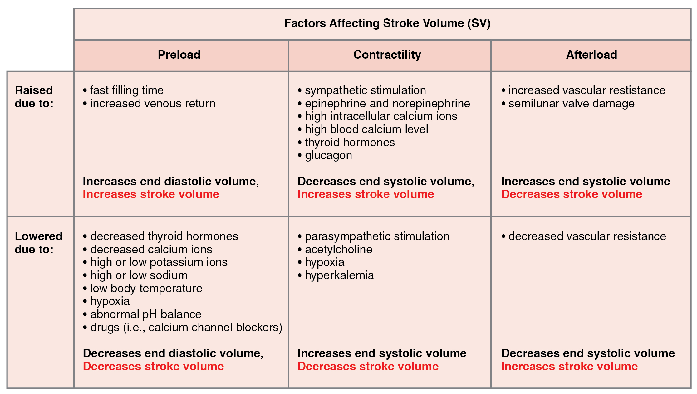 Many of the same factors that regulate HR also impact cardiac function by altering SV. While a number of variables are involved, SV is ultimately dependent upon the difference between EDV and ESV. The three primary factors to consider are preload, or the stretch on the ventricles prior to contraction; the contractility, or the force or strength of the contraction itself; and afterload, the force the ventricles must generate to pump blood against the resistance in the vessels. These factors are summarized in [link] and [link].