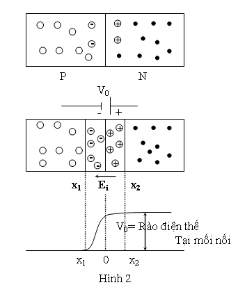 Lấy tích phân 2 vế từ x1 đến x2 và để ý rằng tại x1 điện thế được chọn là 0volt, mật độ lỗ trống là mật độ Ppo ở vùng P lúc cân bằng. Tại x2, điện thế là V0 và mật độ lỗ trống là Pno ở vùng N lúc cân bằng.