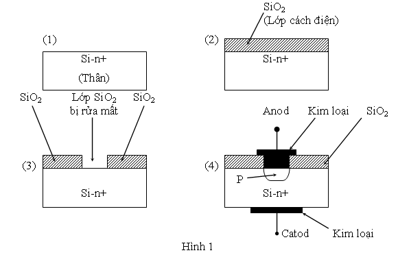 Trước tiên, người ta dùng một thân Si-n+ (nghĩa là pha khá nhiều nguyên tử cho). Trên thân này, người ta phủ một lớp cách điện SiO2 và một lớp verni nhạy sáng. Xong người ta đặt lên lớp verni một mặt nạ có lỗ trống rồi dùng một bức xạ để chiếu lên mặt nạ, vùng verni bị chiếu có thể rửa được bằng một loại axid và chừa ra một phần Si-n+, phần còn lạivẫn được phủ verni. Xuyên qua phần không phủ verni, người ta cho khuếch tán những nguyên tử nhận vào thân Si-n+ để biến một vùng của thân này thành Si-p. Sau cùng, người ta phủ kim loại lên các vùng p và n+ và hàn dây nối ra ngoài. Ta được một nối P-N có mặt nối giữa vùng p và n+ thẳng.