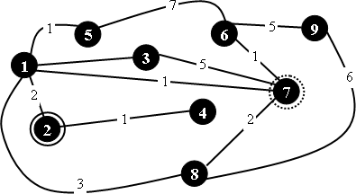 Hình : Mô hình chung của các vấn đề-bài toán phải giải quyết bằng phương pháp tìm kiếm lời giải. Không gian tìm kiếm là một tập hợp trạng thái - tập các nút của đồ thị. Chi phí cần thiết để chuyển từ trạng thái T này sang trạng thái Tkđược biểu diễn dưới dạng các con số nằm trên cung nối giữa hai nút tượng trưng cho hai trạng thái.