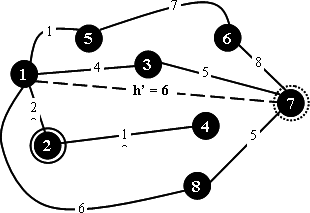 Hình Chi phí ước lượng h’ = 6 và chi phí tối ưu thực sự h = 4+5 = 9 (đi theo đường 1-3-7)