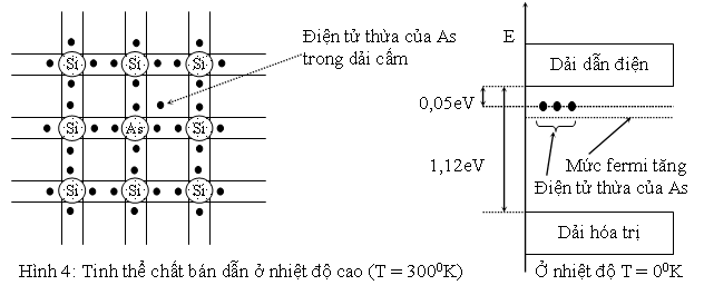 Giả sử ta pha vào Si thuần những nguyên tử thuộc nhóm V của bảng phân loại tuần hoàn như As (Arsenic), Photpho (p), Antimony (Sb). Bán kính nguyên tử của As gần bằng bán kính nguyên tử của Si nên có thể thay thế một nguyên tử Si trong mạng tinh thể. Bốn điện tử của As kết hợp với 4 điện tử của Si lân cận tạo thành 4 nối hóa trị, Còn dư lại một điện tử của As. Ở nhiệt độ thấp, tất cả các điện tử của các nối hóa trị đều có năng lượng trong dải hóa trị, trừ những điện tử thừa của As không tạo nối hóa trị có năng lượng ED nằm trong dải cấm và cách dẫy dẫn điện một khỏang năng lượng nhỏ chừng 0,05eV.