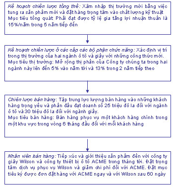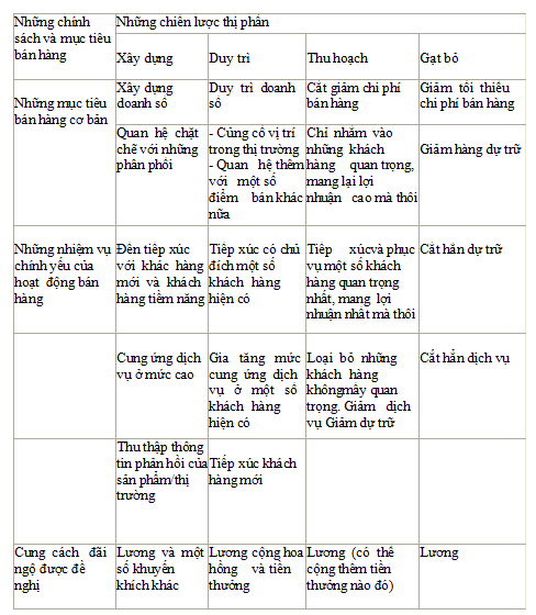 Những chiến lược và kế hoạch kinh doanh được áp dụng và thi hành hàng ngày qua hoạt động của họ như thế nào. Cuối cùng, ở cấp giám đốc quản lý bán hàng và những đại diện bán hàng, những mục tiêu ấy được xác định rất cụ thể bao gồm những mục tiêu doanh số phải đạt được trong vùng hoặc đối với từng khách hàng. Bên cạnh đó, hoạt động của nhân viên bán hàng cũng được giới hạn cụ thể để đạt được những mục tiêu nêu trên. Vì thế, những kế hoạch và chiến lược tổng hợp của Công ty mới được thực hiện thông qua hoạt động hàng ngày của lực lượng bán hàng theo lĩnh vực.
