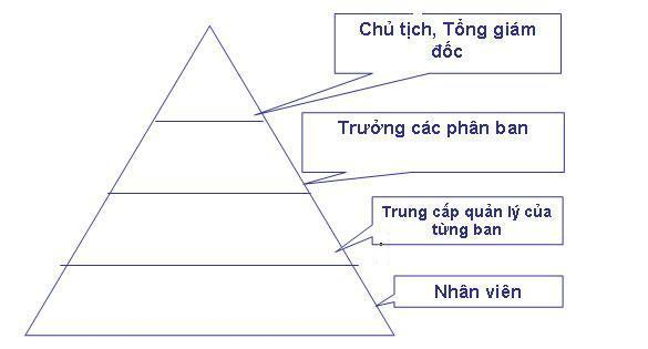 Như được mô tả trong hình 2.1, cấu trúc tổ chức của Công ty thường là mang hình kim tự tháp. Đỉnh của kim tự tháp này chính là Hội đồng giám đốc và Chủ tịch Hội đồng quản trị (CEO) và một số chuyên viên điều hành khác nữa. Đối với công ty dù lớn hay nhỏ thì hình dạng của sơ đồ này thông thường là giống nhau. Điểm khác biệt, có chăng, là ở quy mô, kích thước của sơ đồ mà thôi. Dưới quyền của những chuyên viên cao cấp này là hàng loạt những cán bộ thừa hành có trách nhiệm điều hành hoạt động của những thành tố trong công ty sao cho có nhiều lợi nhuận nhất.