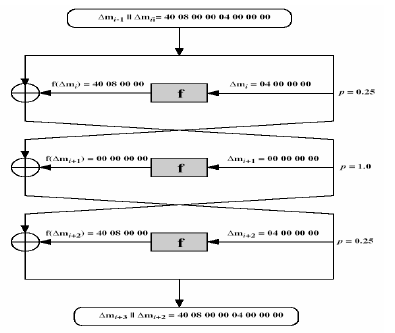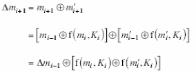 o Trong công thức sau với hai đầu vào khác nhau, vế trái là sự khác biệt mã ở cùng vòng thứ i được biểu diễn qua sự khác biệt mã ở vòng trước đó i-1 và sự khác biệt của hàm f trong ngoặc vuông.