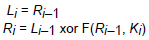 Sử dụng hai nửa 32 bít trái và 32 bít phải. Như đối với mọi mã Fiestel, nửa phải của vòng trước được chuyển qua nửa trái của bước sau và lấy đầu ra của hàm vòng trên nửa phải và khoá con cộng cơ số 2 với nửa trái. Có thể biểu diễn bằng công thức như sau: