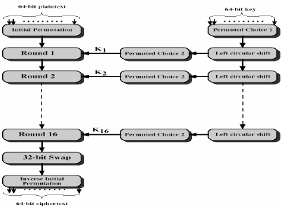 - Hoán vị ban đầu IP: đây là bước đầu tiên của tính toán dữ liệu, hoán vị IP đảo thứ tự các bít đầu vào: các bít chẵn sang nửa trái và các bít lẻ sang nửa phải. Hoán vị trên dễ dàng thực hiện trên phần cứng. Mỗi số trong hệ 16 biểu diễn bởi 4 bit, 16 số được thể hiện bởi 64 bit. Mỗi bit có một vị trí xác định qua hoán vị ban đầu (xem bảng phụ lục cuối tài liệu).