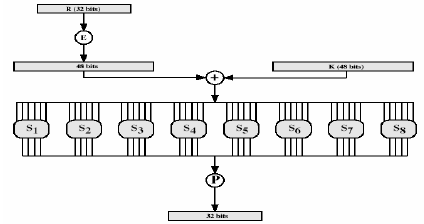 Ở đây F lấy 32 bít nửa phải R, mở rộng thành 48 bít nhờ hoán vị E, rồi cộng vào với khoá con 48 bít. Sau đó chia thành 8 cụm 6 bít và cho qua 8 S-box để nhận được kết quả 32 bít. Đảo lần cuối sử dụng hoán vị 32 bít P nhận được 32 bít đầu ra, rồi cộng với nửa trái để chuyển thành nửa phải của bước sau.