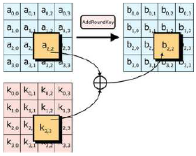 1. AddRoundKey - mỗi byte của khối được kết hợp với khóa con, các khóa con này được tạo ra từ quá trình tạo khóa con Rijndael.
