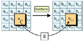2. SubBytes - đây là quá trình thay thế (phi tuyến) trong đó mỗi byte sẽ được thay thế bằng một byte khác theo bảng tra (Tìm trong tài liệu tương ứng).
