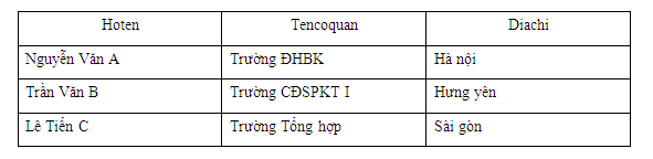 Trong ví dụ trên Hoten, Tencoquan, Diachi là tên của các trường của Data File.