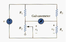 The Wheatstone bridge (or resistance bridge) circuit is used in a number of applications. Here we will use it to measure an unknown resistance. The unknown resistance is connected to the bridge as shown in [link]. The variable resistance is adjusted until no current flows through the galvanometer, which is essentially a d’Arsonval movement operating as a sensitive current-indicating device like an ammeter in the microampere range. Under this condition , and the bridge is said to be balanced. Since no current flows through the galvanometer, and behave as though they were in series; so do and . The fact that no current flows through the galvanometer also implies that . Applying the voltage division principle,