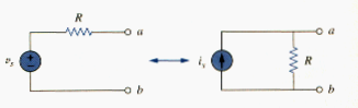 The two circuits in [link] are equivalent – provided they have the same voltage–current relation at terminals a-b. It is easy to show that they are indeed equivalent. If the sources are turned off, the equivalent resistance at terminals a-b in both circuits is R. Also, when terminals a-b are short circuited, the short circuit current flowing from a to b is in the circuit in the left hand side and for the circuit on right hand side. Thus, in order for the two circuits to be equivalent. Hence, source transformation requires that