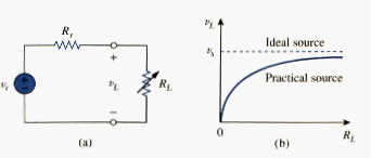 Source modeling provides an example of the usefulness of the Thevenin or the Norton equivalent. An active source such as a battery is often characterized by its Thevenin or Norton equivalent circuit. An ideal voltage source provides a constant voltage irrespective of the current drawn by the load, while an ideal current source supplies a constant current regardless of the load voltage. As [link] shows practical voltage and current sources are not ideal, due to their internal resistances or source resistances and . They become ideal as and . To show that this is the case, consider the effect of the load on voltage sources, as shown in [link](a). By the voltage division principle, the load voltage is
