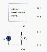 Norton theorem states that a linear two-terminal circuit can be replaced by an equivalent circuit consisting of a current source in parallel with a resistor , where is the short-circuit current through the terminals and is the input or equivalent resistance at the terminals when the independent sources are turned off.