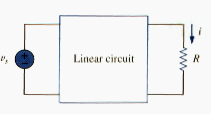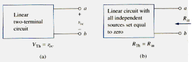 Thevenin’s theorem states that a linear two-terminal circuit can be replaced by an equivalent circuit consisting of a voltage source in series with a resistor , where is the open-circuit voltage at the terminals and is the input or equivalent resistance at the terminals when the independent sources are turned off.