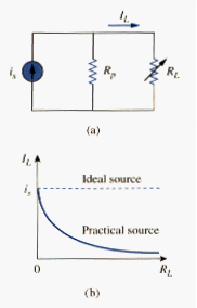 The same argument can be made for a practical current source when connected to a load as shown in [link]. By the current division principle,