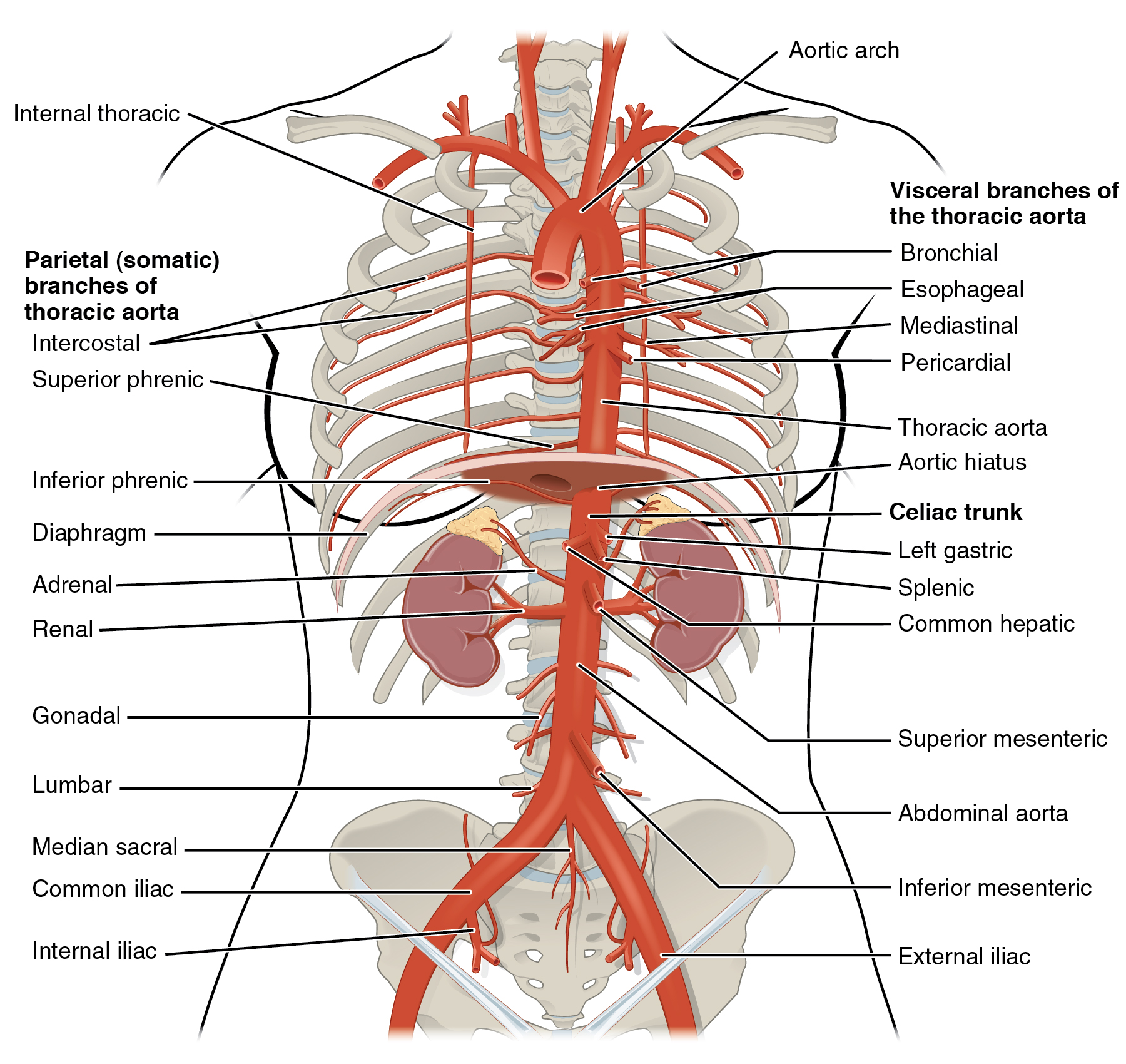 After crossing through the diaphragm at the aortic hiatus, the thoracic aorta is called the abdominal aorta (see [link]). This vessel remains to the left of the vertebral column and is embedded in adipose tissue behind the peritoneal cavity. It formally ends at approximately the level of vertebra L4, where it bifurcates to form the common iliac arteries. Before this division, the abdominal aorta gives rise to several important branches. A single celiac trunk (artery) emerges and divides into the left gastric artery to supply blood to the stomach and esophagus, the splenic artery to supply blood to the spleen, and the common hepatic artery, which in turn gives rise to the hepatic artery proper to supply blood to the liver, the right gastric artery to supply blood to the stomach, the cystic artery to supply blood to the gall bladder, and several branches, one to supply blood to the duodenum and another to supply blood to the pancreas. Two additional single vessels arise from the abdominal aorta. These are the superior and inferior mesenteric arteries. The superior mesenteric artery arises approximately 2.5 cm after the celiac trunk and branches into several major vessels that supply blood to the small intestine (duodenum, jejunum, and ileum), the pancreas, and a majority of the large intestine. The inferior mesenteric artery supplies blood to the distal segment of the large intestine, including the rectum. It arises approximately 5 cm superior to the common iliac arteries.