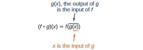 It is also important to understand the order of operations in evaluating a composite function. We follow the usual convention with parentheses by starting with the innermost parentheses first, and then working to the outside. In the equation above, the functiontakes the inputfirst and yields an outputThen the functiontakesas an input and yields an output
