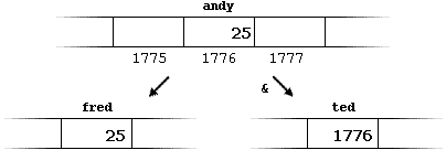 Chúng ta đã gán cho fred nội dung của biến andy như chúng ta đã làm rất lần nhiều khác trong những phần trước nhưng với biến ted chúng ta đã gán địa chỉ mà hệ điều hành lưu giá trị của biến andy, chúng ta vừa giả sử nó là 1776.