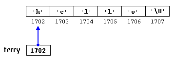 trong trường hợp này một khối nhớ tĩnh được dành để chứa "hello" và một con trỏ trỏ tới kí tự đầu tiên của khối nhớ này (đó là kí tự h') được gán cho terry. Nếu "hello" được lưu tại địa chỉ 1702, lệnh khai báo trên có thể được hình dung như thế này: