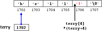 hãy nhớ rằng viết terry[4] là hoàn toàn giống với viết *(terry+4) mặc dù biểu thức thông dụng nhất là cái đầu tiên. Với một trong hai lệnh trên xâu do terry trỏ đến sẽ có giá trị như sau: