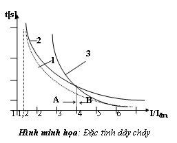 Để có tác dụng bảo vệ đặc tính cầu chảy 1 luôn thấp hơn đặc tính thiết bị (đường 2) nhưng đặc tính thực tế là đường 3 trong vùng có quá tải lớn (vùng B) bảo vệ được còn vùng (A) quá tải nhỏ không bảo vệ được. Thực tế dòng khi quá tải không lớn hơn (1,52)Iđm thì sự phát nóng diễn ra chậm, phần lớn nhiệt tỏa ra môi trường xung quanh nên cầu chảy không bảo vệ được quá tải nhỏ.