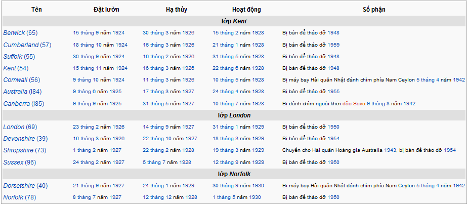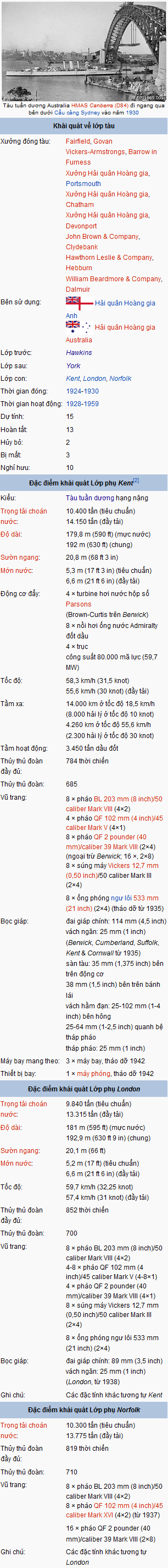 Bảy chiếc đầu tiên trong lớp: Berwick, Cornwall, Cumberland, Kent và Suffolk của Hải quân Hoàng gia cùng Australia và Canberra của Hải quân Hoàng gia Australia hình thành nên lớp Kent. Tất cả đều được đặt hàng vào năm 1924 và đưa ra hoạt động vào năm 1928. Người ta nhanh chóng nhận ra cần phải nâng thêm chiều cao con tàu khoảng 4,5 m (15 ft) để khói thải không che khuất cấu trúc thượng tầng phía sau. Ống khói của các con tàu Australia và Canberra của Australia còn được nâng thêm 0,9 m (3 ft). Từ năm 1930 đến năm 1933 máy bay và máy phóng được bổ sung, cũng như các bộ điều khiển hỏa lực góc cao HACS cho các khẩu pháo 102 mm (4 inch). Kent được bổ sung thêm một cặp pháo 102 mm (4 inch) vào năm 1934, và nó cùng với Berwick và Cornwall đều được bổ sung một cặp súng máy Vickers 12,7 mm (0,50) bố trí phía trước ống khói trước.