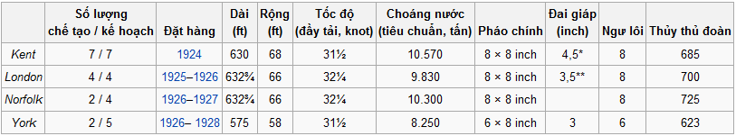 Mười lăm chiếc lớp County được chế tạo trong ba lớp phụ khác biệt: Kent, London và Norfolk. Chúng là những tàu tuần dương 10.000 tấn và pháo 8 inch duy nhất, hay còn gọi là tàu tuần dương "A", mà Hải quân Hoàng gia chế tạo. Những chiếc County được ghi nhớ với đặc trưng ba ống khói và đã phục vụ trên mọi chiến trường trong Thế Chiến II.